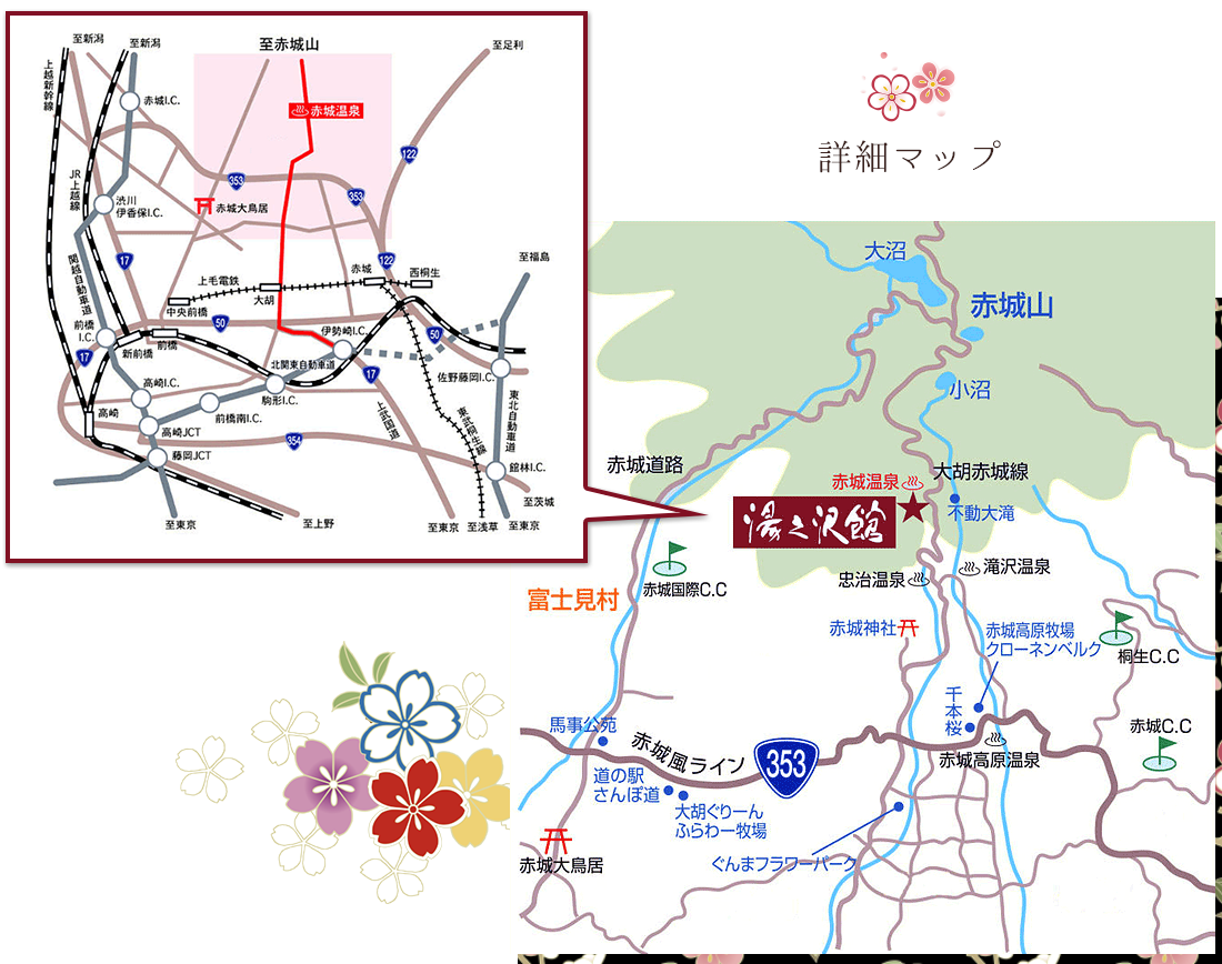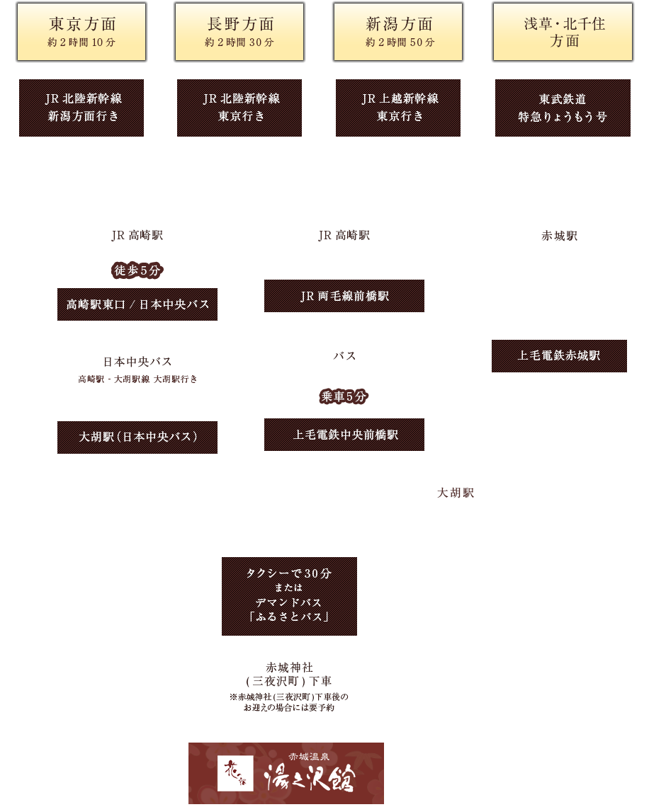 大胡駅からはタクシーの他にふるさとバスをご利用になりお越し頂けます。 ふるさとバスをご利用になり赤城神社(三夜沢町)バス停までお越し下さい。 ご宿泊者様に限り、予約制にはなりますが赤城神社から宿までの送迎をいたします。 気軽にお問い合わせ下さい。 尚、ふるさとバス詳細につきましては下記よりご確認下さい。