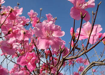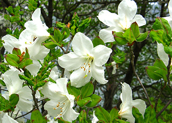 自生しているものは中腹から山頂まで随所で咲きますが、麓で植生された「アカヤシオの丘」ではたくさんの花が咲き誇ります。また、山頂方面では鳥居峠脇の篭山や最高峰黒檜山でも見られます。