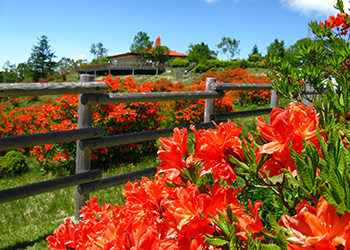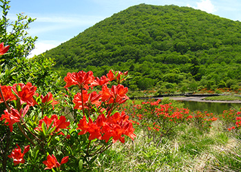 群馬県の県花でもあるレンゲツツジ。鍋割山山頂などでも見られますが、群生で有名な見どころは新坂平・白樺牧場。開花時には広大な牧場内一面が花の朱色で埋め尽くされ、圧倒されるほどです